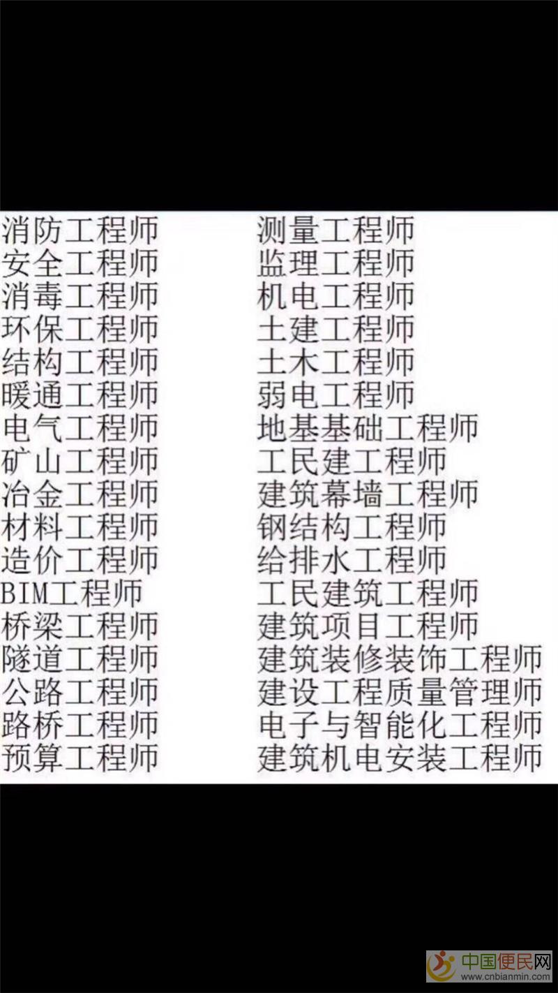 消防工程师 建筑工程师 园林工程师 电气工程师 水电工程师 土建工程师 机电工程师 暖通工程师 机械工程师 路桥工程中_国_便_民_网